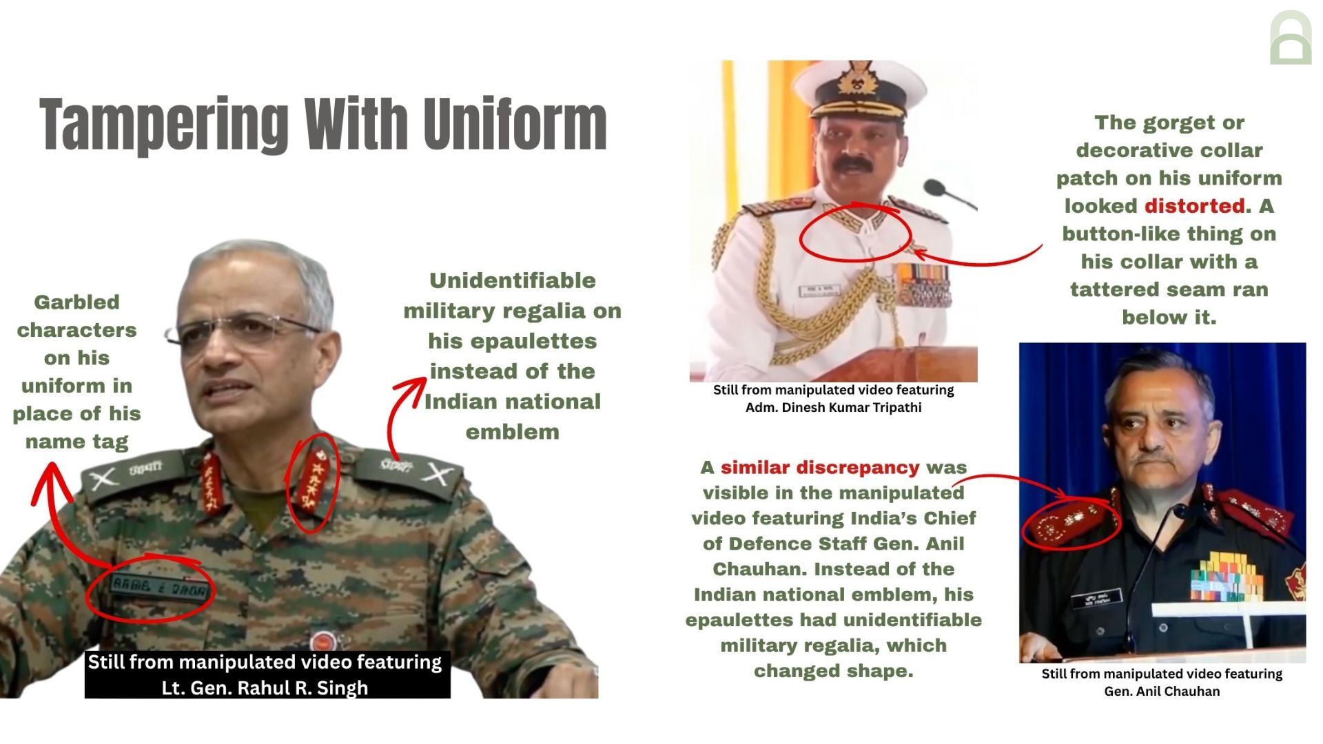 In the videos that apparently featured defence officials they were seen in uniform, giving a speech or making a statement. The insignia on their uniform and their name tags were manipulated in most cases.