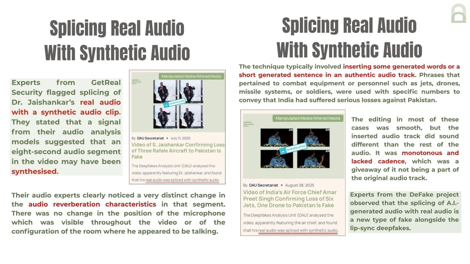 In some cases some words that were part of the original audio track were kept in the synthetic audios. We also saw a few examples of audio splicing, which involved stitching together parts of the original audio with the synthetic audio tracks.
