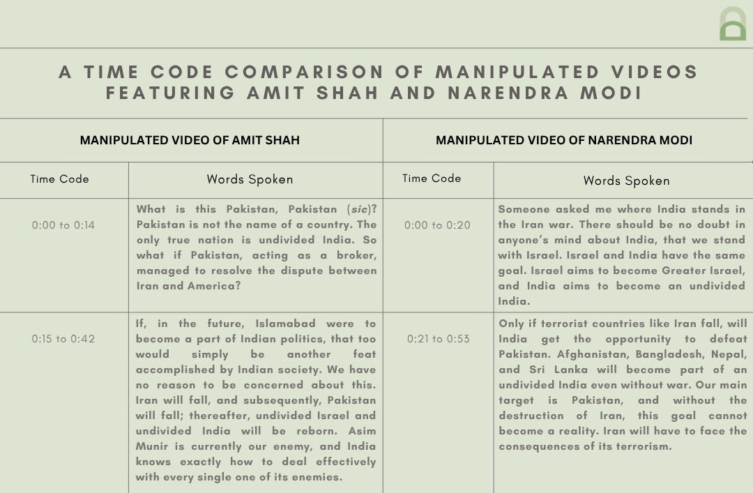 Shared below is a table that compares the English translation of the speech in Shah’s manipulated video and the transcript of the audio in Mr. Modi’s manipulated video. We want to give our readers a sense of how the audio tracks are being used to peddle a certain narrative. We, of course, do not intend to give any oxygen to the bad actors behind this content.
