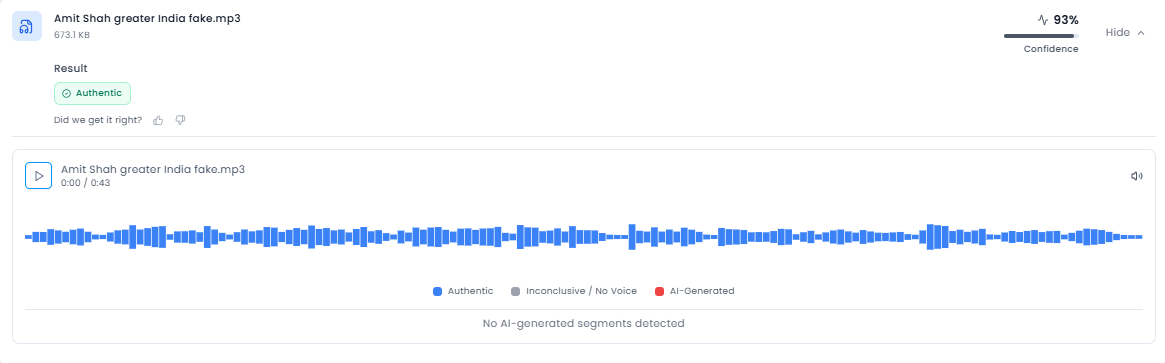 We ran the audio track through the advanced audio deepfake detection engine of Aurigin.ai, a Swiss deeptech company. The results indicated 93 percent confidence in the audio track being authentic.