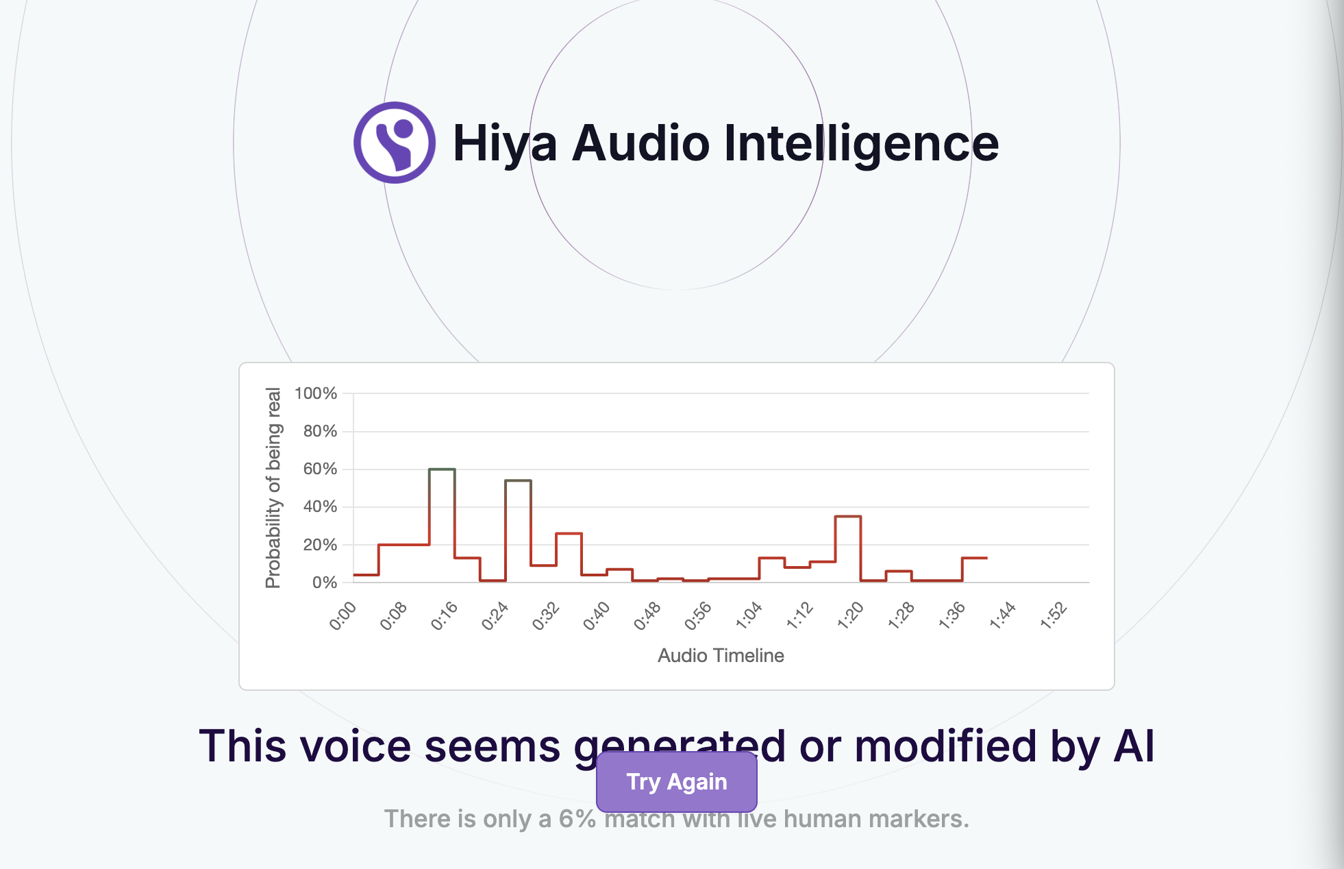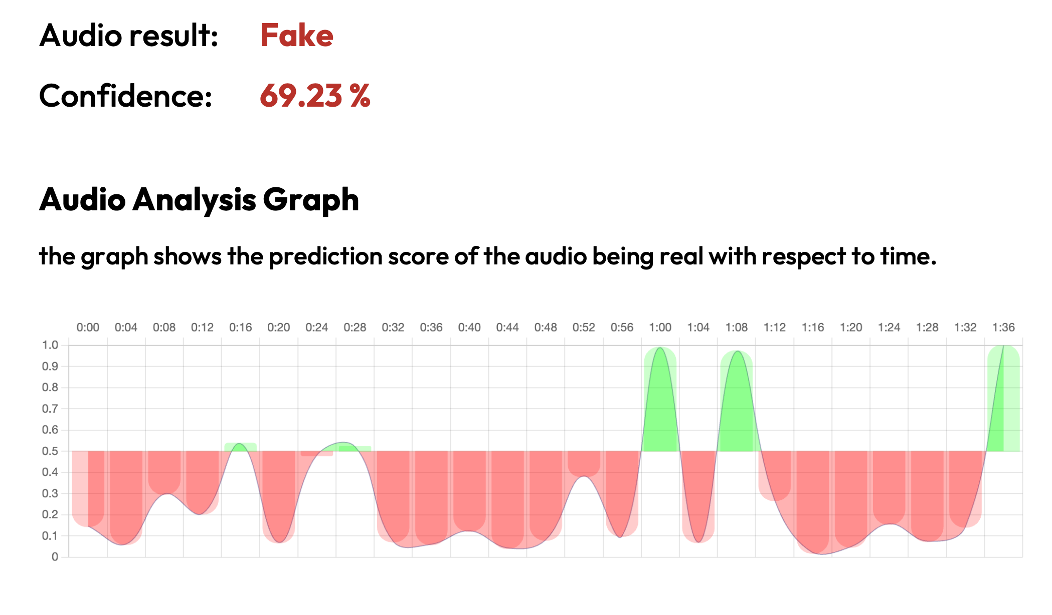 We also ran the audio track through the advanced audio deepfake detection engine of Aurigin.ai, a Swiss deeptech company. The results indicated 100 percent confidence in the audio track being A.I.-generated.