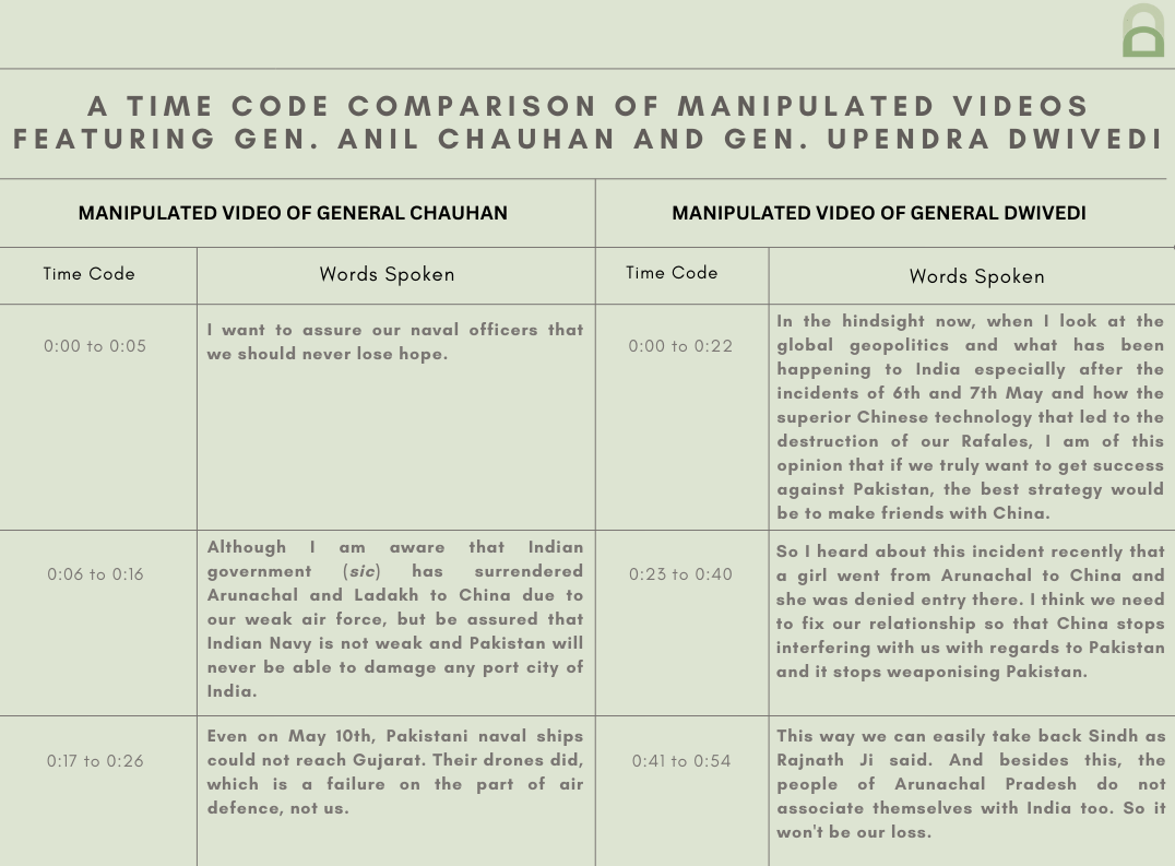 Short video clips from the source video featuring Gen. Chauhan seem to have been lifted and stitched together to create the manipulated version. The manipulated video of Gen. Dwivedi looks seamless without any visible jump cuts or transitions, however, the clips in the source video which are identical to the doctored clip are shorter in duration.