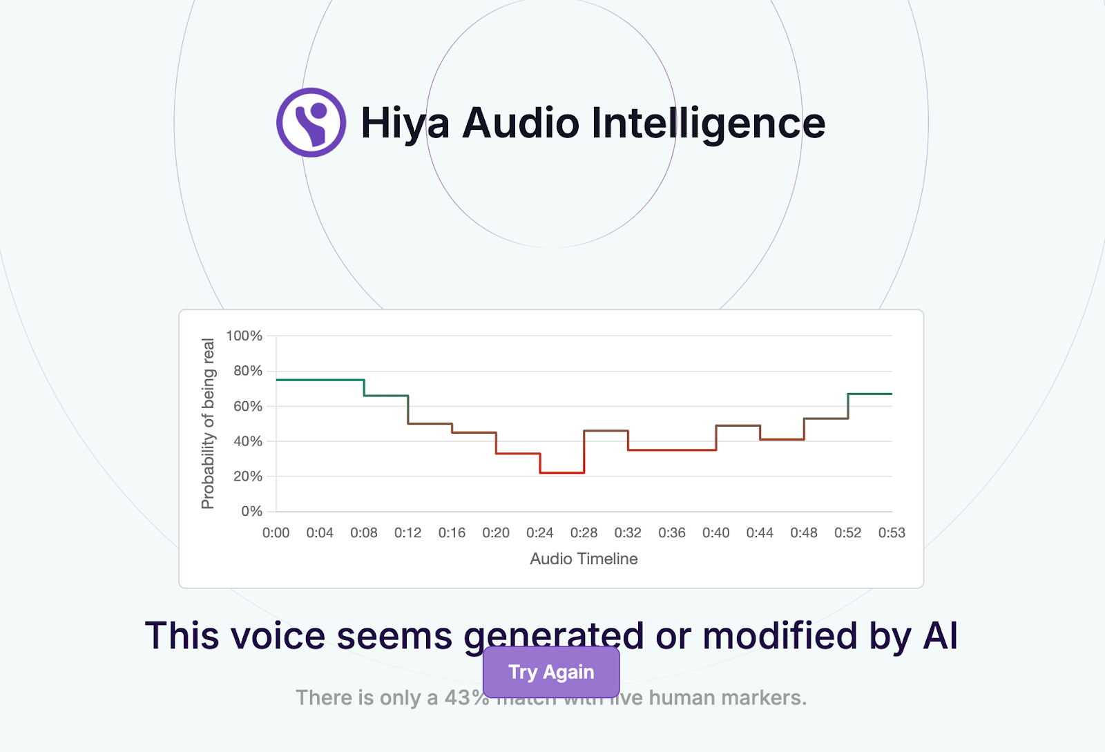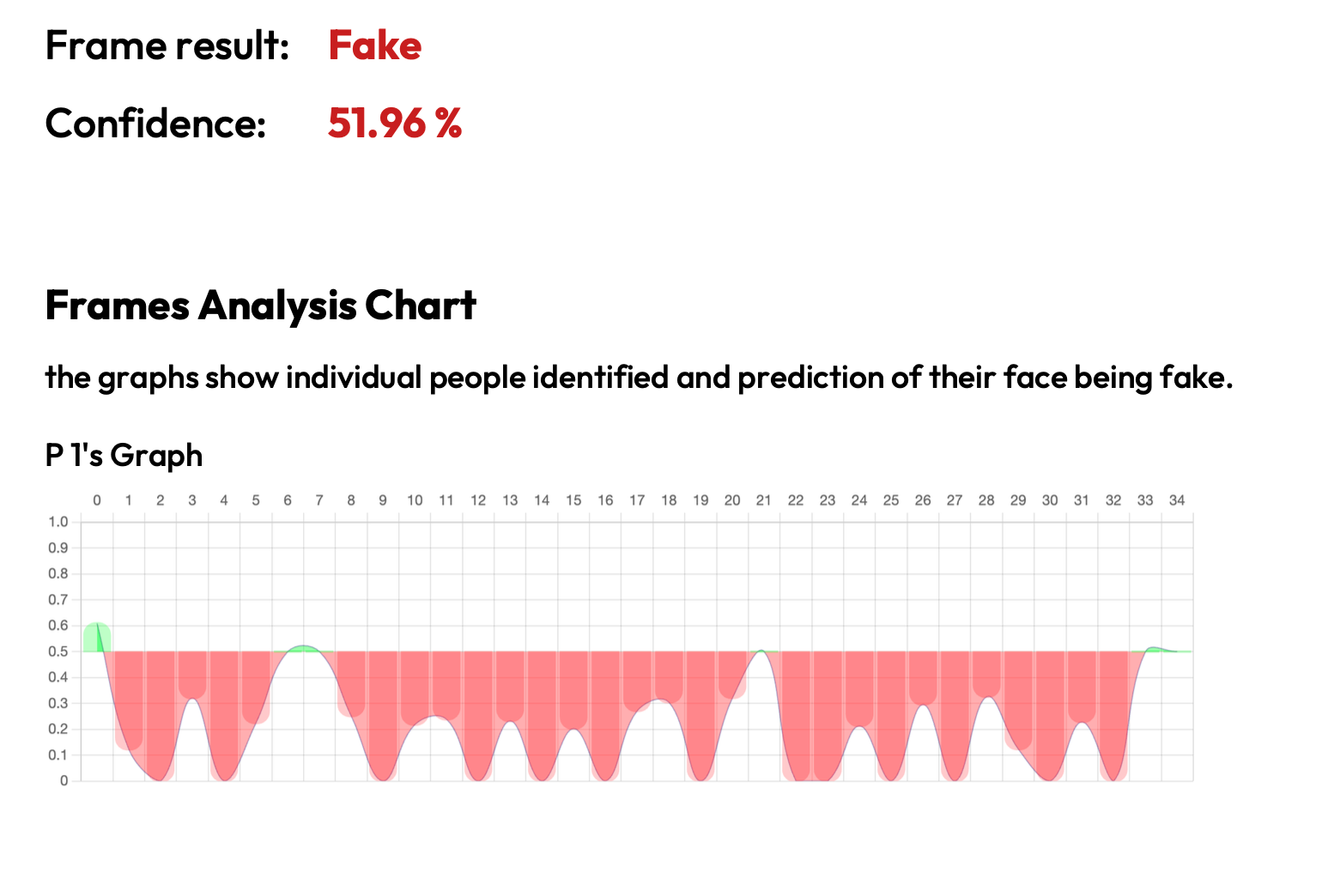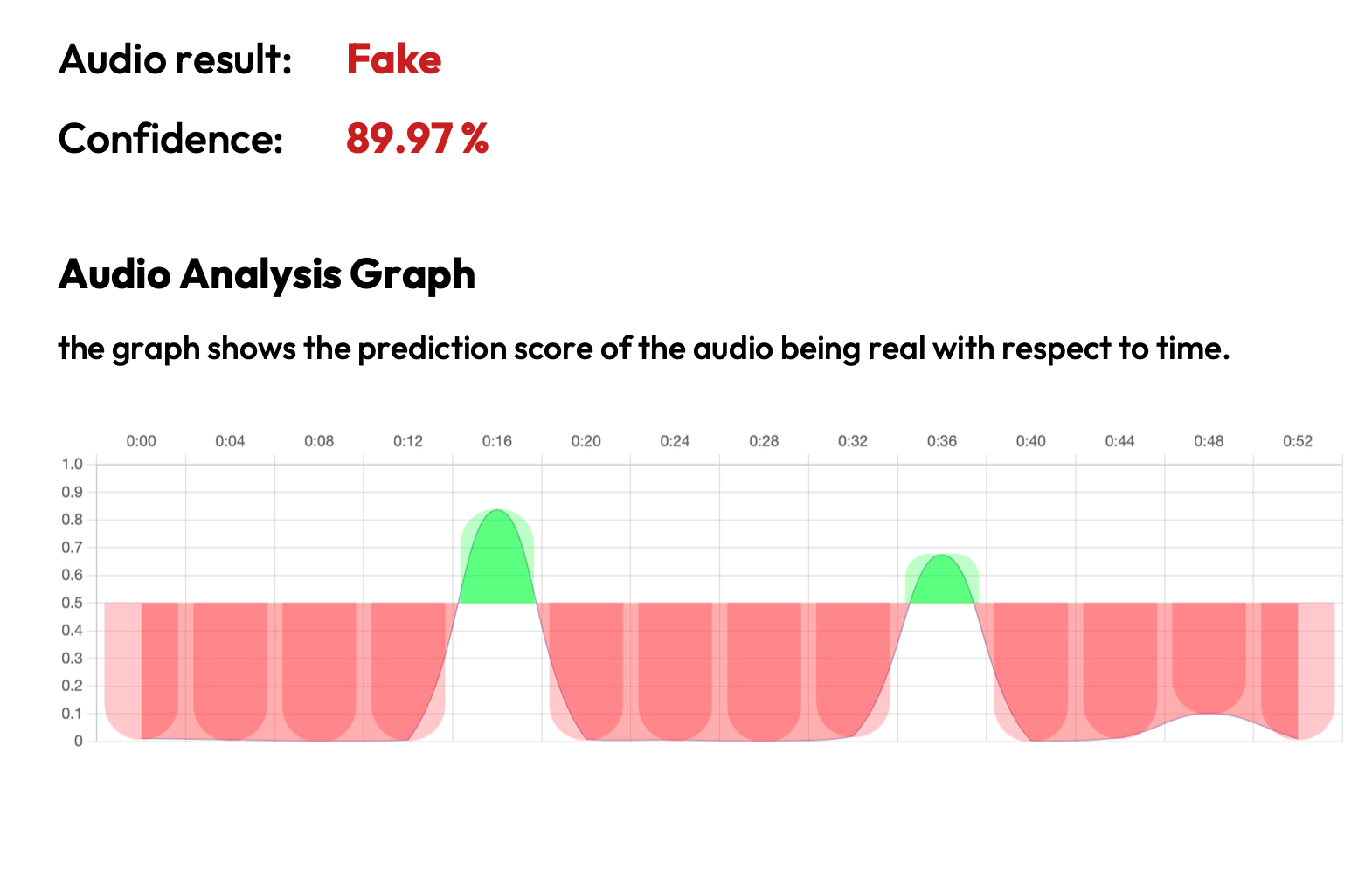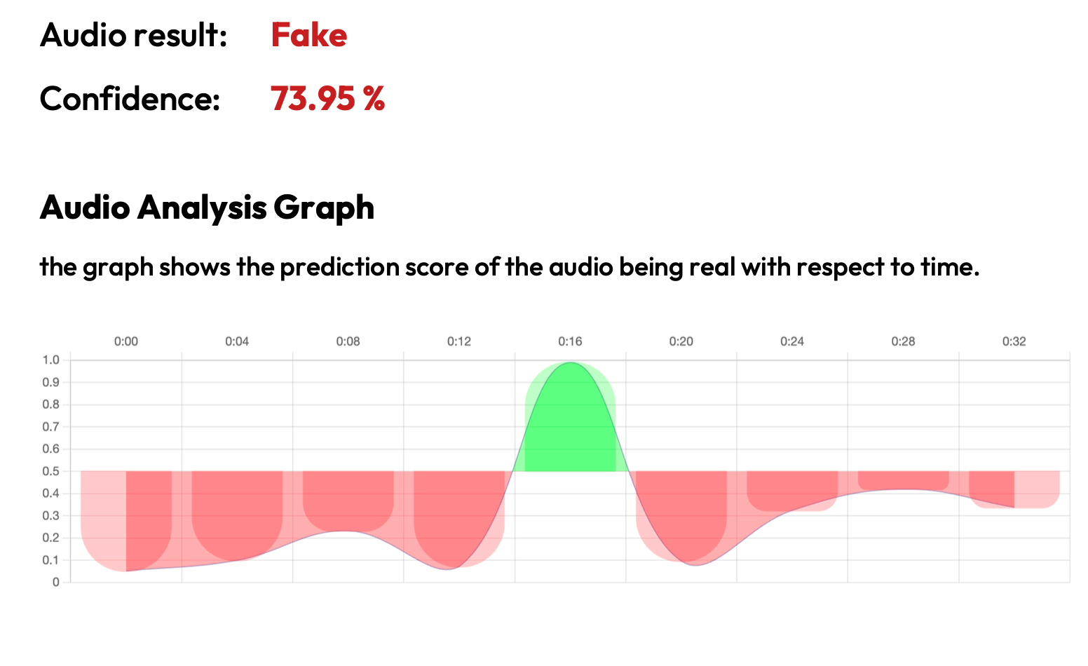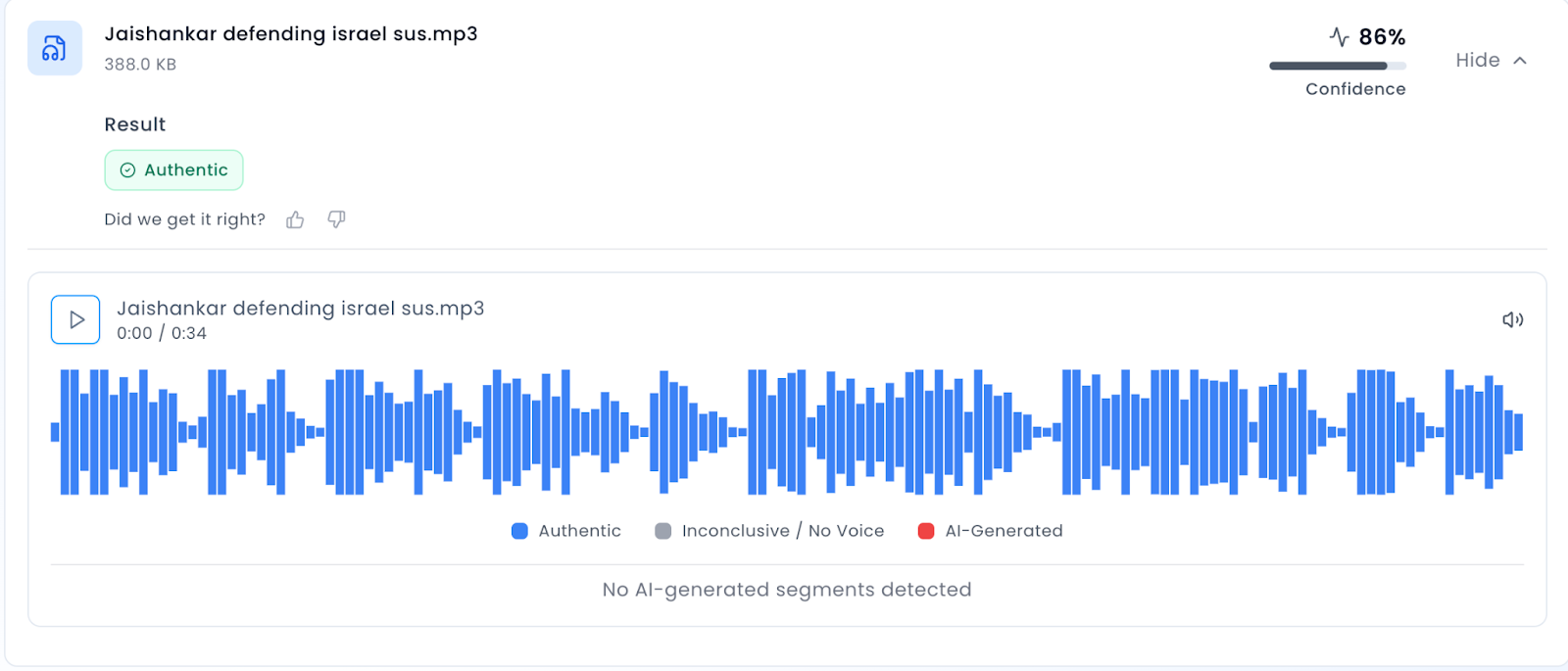 The team noted that the quality of Jaishankar’s purported video is extremely low, hence their video detection model was unable to give a strong prediction. They added that the audio track had clear signs of A.I., which is explained by the strong confidence score (see below). They suggested that it is a lip-sync attack.